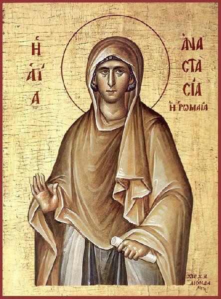 Святая Анастасия Римляныня осиротела в возрасте трех лет. Воспитывалась она в монастыре близ Рима, в котором приняла иночество. При императоре Декии (249–251 гг.) Анастасии исполнился 21 год. Она была очень красивой, и многие знатные римляне просили ее руки, но Анастасия всем отказывала, предпочитая остаться невестой Христовой.