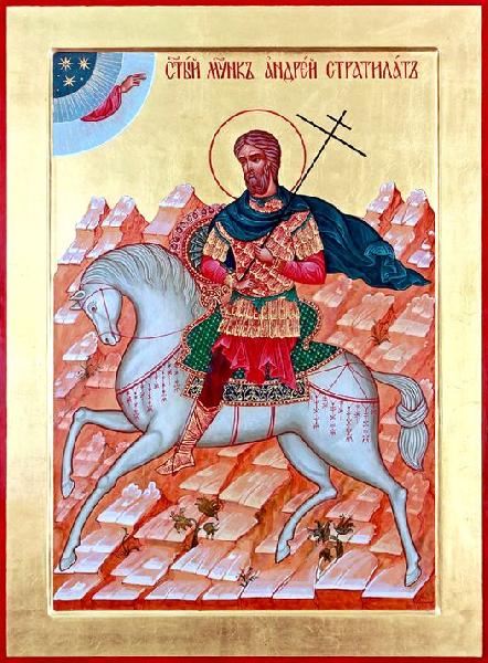 Мученик Андрей Стратилат был римским военачальником при императоре Максимиане. Во время войны с Сирией святому Андрею дали титул «стратилат», то есть главнокомандующий.