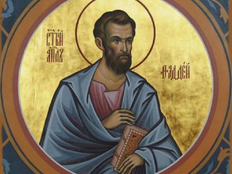 Апостол від сімидесяти Фаддей, єпископ Едеський, Бейрутський. Святий I століття від Різдва Христового. Входив до сімдесяти учнів Спасителя, яких Він обрав за першими 12 апостолами. Учень святого Іоанна Хрестителя, який хрестив Фаддея, тим самим привівши до Христа. Потім цей святий став одним із учнів Самого Спасителя.