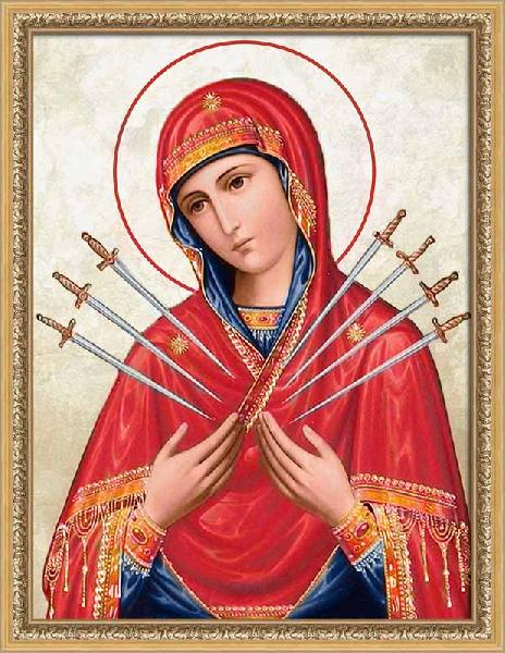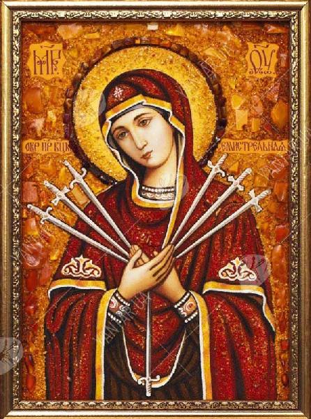 «Умягчение злых сердец»… Сколько в одном названии этой иконы надежды — надежды на то, что будет когда-нибудь торжествовать правда на земле, что люди станут добры и милосердны, станут любить друг друга. И как трудно это в нашем ожесточенном мире, и подчас только вид чужого страдания способен смягчить наше собственное злое сердце… Эту икону называют еще «Симеоново проречение». Как повествует евангелист Лука, праведному старцу Симеону Богоприимцу было предсказано Духом Святым, что не умрет он, пока не увидит Мессию. И вот когда родители на сороковой день после рождения Младенца принесли Его в Иерусалимский Храм, пришел туда «по вдохновению» и Симеон, взял Младенца на руки (откуда и прозвание Богоприимец) и произнес знаменитые слова, которыми с тех пор завершается каждая служба вечерни и известные как Молитва святого Симеона Богоприимца: «Ныне отпущаеши раба Твоего, Владыко, по глаголу Твоему, с миром…» После же он благословил святого Иосифа и Пречистую Матерь Спасителя и обратился к Марии с тем самым Симеоновым проречением: «се, лежит Сей на падение и на восстание многих в Израиле и в предмет пререканий, — и Тебе Самой оружие пройдет душу, —да откроются помышления многих сердец». Подобно тому как Христа пронзят гвоздями и копием, так и душу Пречистой поразит некое «оружие» печали и сердечной боли, когда узрит Она страдания Сына; после же откроются скрытые доселе помышления (о Мессии) людей, которым предстоит сделать выбор: с Христом они или против Него. Такое толкование Симеонова пророчества и стало предметом нескольких «символических» икон Богородицы. Все прибегающие к ним с молитвою чувствуют, что при умягчении сердца облегчаются страдания душевные и телесные, и сознают: когда молятся пред этими образами за врагов своих, тогда смягчаются их враждебные чувства, уступая место милосердию, утихают междоусобная брань и вражда. Образ «Умягчение злых сердец» происходит, по всей видимости, из Юго-Западной Руси, однако исторических сведений о нем, к сожалению, не было никогда и никаких; неизвестно даже, где и когда икона явилась. Пречистая «Умягчение злых сердец» пишется с вонзенными в Ее сердце мечами – по три справа и слева, один снизу. Число «семь» в Священном Писании обычно означает полноту, избыточность чего-либо, а в данном случае – полноту и бескрайность того горя, печали и «болезни сердечной», которые испытала Богородица во время Ее земной жизни. Иногда на коленях Пречистой Девы пишется еще и Предвечный Младенец. Празднование этому образу совершается в Неделю Всех святых (в первое воскресенье после Троицы). Очень близок к «Умягчению злых сердец» и другой чудотворный образ — икона Божией Матери «Семистрельная». Разница между ними лишь в том, что на «Семистрельной» мечи пишутся иначе — три с правой стороны Пречистой и четыре с левой, а празднование ей совершается 13 августа по старому стилю.