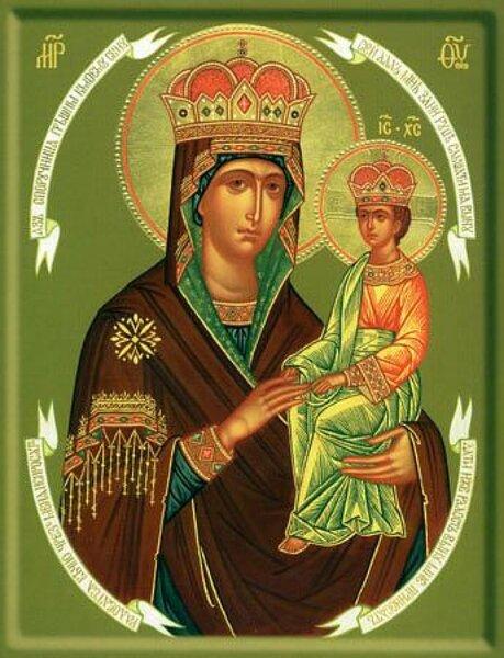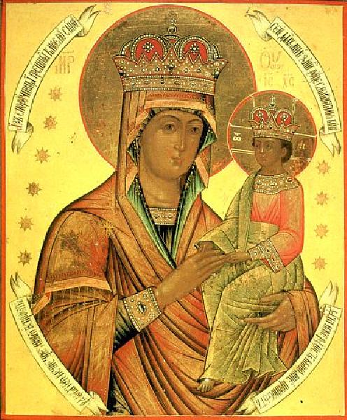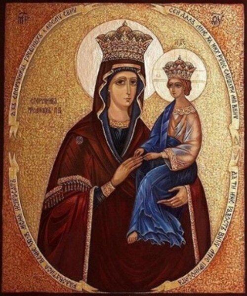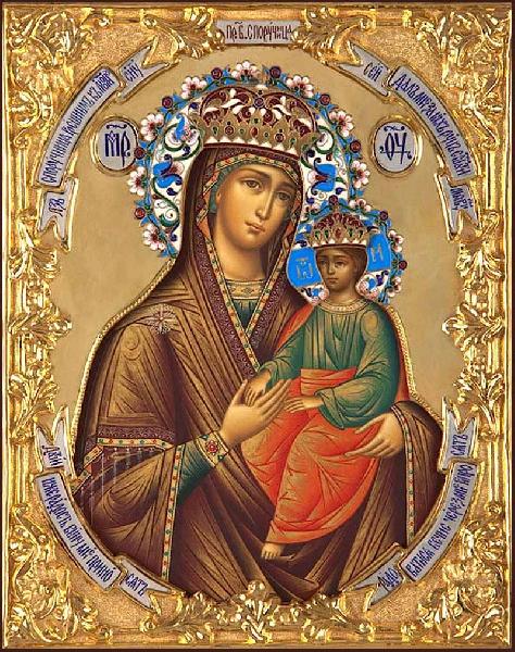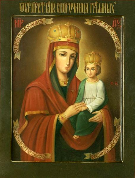 Ікона Божої Матері «Споручниця грішних» названа так відповідно до напису, що зберігся на іконі: «Аз Споручница грешных к Моему Сыну…»