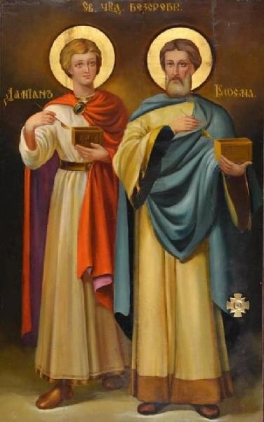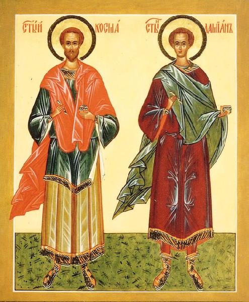 Святые Косма и Дамиан (братья по плоти) жили в III веке по Р. X. в Малой Азии. Ведя праведную и непорочную жизнь, они были также искусными врачами и стяжали от Господа дар — силою молитв исцелять душевные и телесные болезни людей и лечить животных. За свой труд они никогда не брали платы, и поэтому их называют бессребрениками. Церковь Христова признает за святыми Космой и Дамианом благодатный дар исцеления недугов человеческих, а также почитает их небесными покровителями нерушимости христианской семьи.