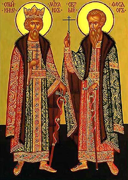 Пока носили ответ его хану, князь Михаил и боярин его пели псалмы и приобщились святых Даров, данных им епископом. Скоро явились убийцы. Они схватили Михаила, начали бить кулаками и палками по груди, потом повернули лицом к земле и топтали ногами, наконец отсекли ему голову. Последнее слово его было: «Я христианин!» После него таким же образом был замучен его доблестный боярин.
