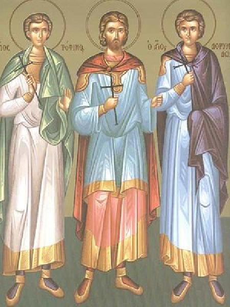 Доримедонт, первый из городских советников, посетил святого Трофима в тюрьме и также исповедал христианство перед правителем. Тот приказал разорвать ему щеки и бока, вырвать зубы и подвергнуть многим другим мучениям. После этого Перенний повелел привести их к нему. Поскольку святые еще усерднее свидетельствовали о любви ко Христу, более сильной, чем смерть, Перенний приказал вырвать им глаза и бросить святых на растерзание зверям. Дикие животные даже не дотронулись до святых, чувствуя пребывавшую в них благодать Божию. Тогда правитель приказал их обезглавить.